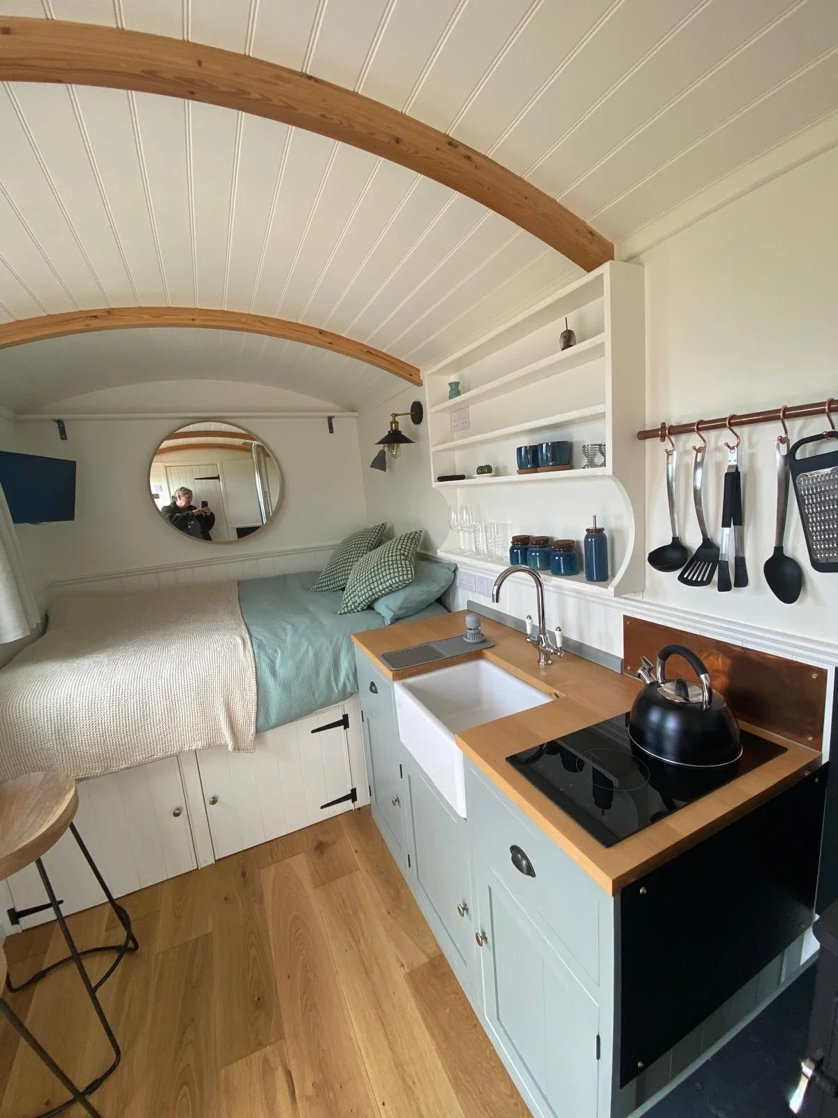 Inside, the hut is fully equipped for a comfortable stay. It includes a private shower room and bathroom, a cosy log burner for chilly evenings, a Belfast sink, induction hobs, a breakfast bar with stools, and a full-size double bed.